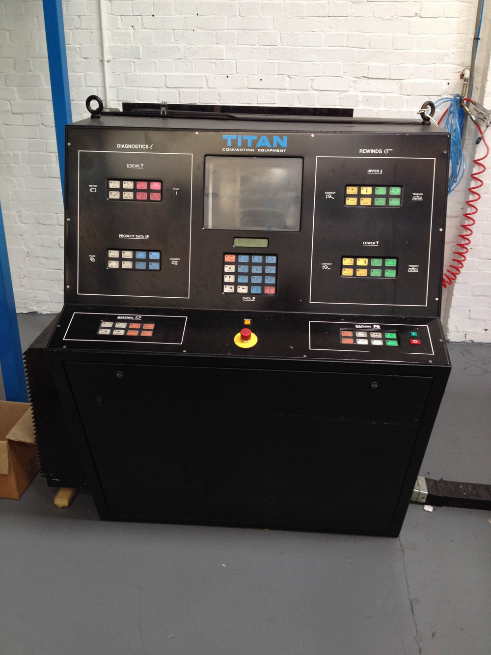 This slitter can be supplied with the existing 590 drives and digital PC controls, or can be upgraded with a new 2014 control system including one 15″ touchscreen control on the rewind and two 7″ touchscreen controls either side of the unwind.